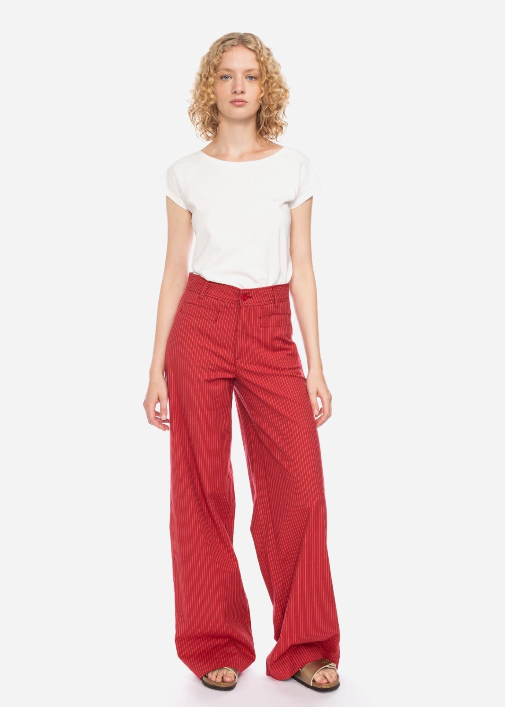 Locker, leicht und voller Sommerlaune – die Hose Lacy zeigt sich jetzt in einem neuen Look für die warme Jahreszeit. Das weite, gerade Bein und der extra hohe Bund schmeicheln deiner Figur und sorgen für eine lässige Silhouette. Der neue Stoff aus elastischer Baumwolle macht jede Bewegung mit und fühlt sich angenehm weich auf der Haut an – perfekt für sonnige Tage und lange Abende draußen. Das rot-rote Streifenmuster bringt frische Farbe ins Spiel und verleiht deinem Outfit das gewisse Etwas – ohne laut zu sein. Und wie immer gilt: fair produziert in Portugal und aus verantwortungsvollen Materialien gefertigt.